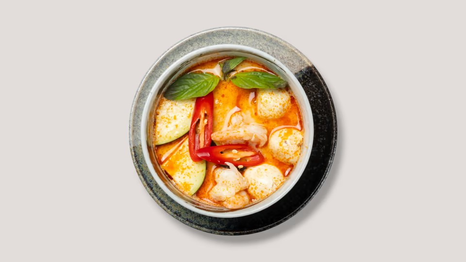 Garnelen, Kokosmilch, Zitronengras, Pilze, Sellerie und Basilikum,