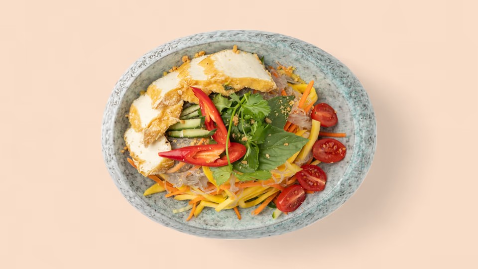 mit Tofu, Mango, Karotten, Gurke, Minze, Koriander, Basilikum und Erdnüssen