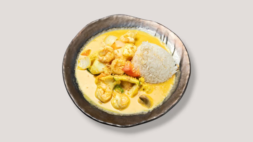 mit Jasminreis, Tofu, verschiedenem Gemüse, Kokosmilch, und Erdnüssen