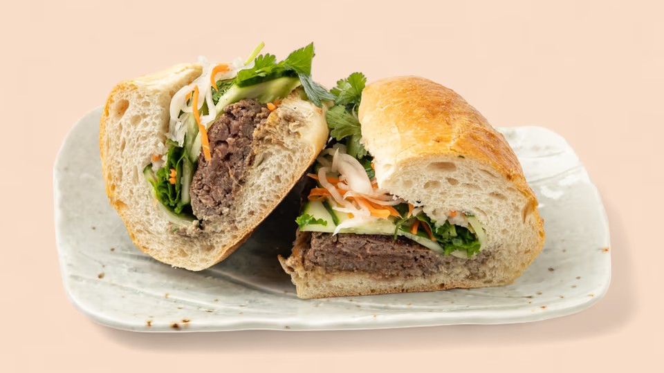Gemüsebrühe mit dicken Reisnudeln, veganer vietnamesischer Wurst, Tofu, Koriander und Minze