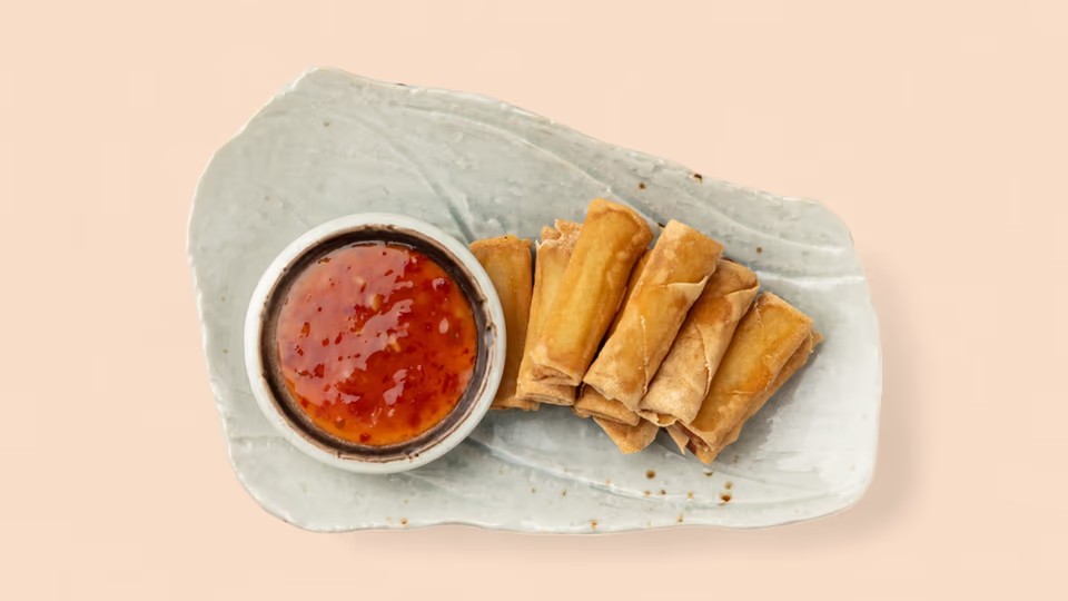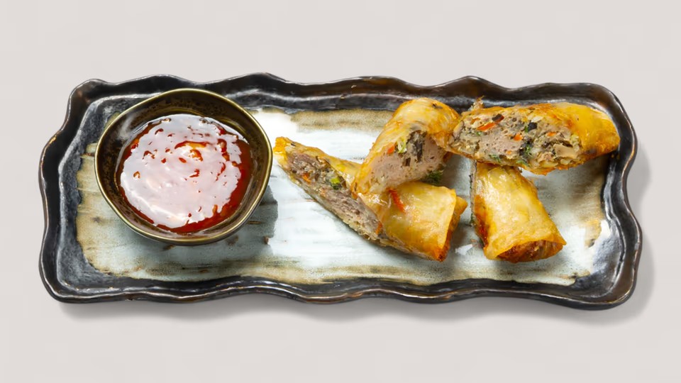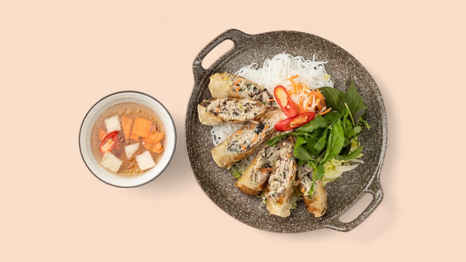 mit Frühlingrollen gèüllt mit Schweinehack, Reisfadennudeln, Eisbergsalat, Fischsauce, Erdnüssen, vietnamesischen Kräutern und Koriande