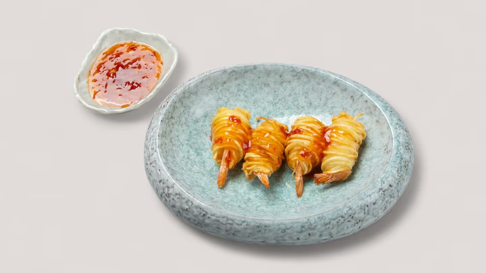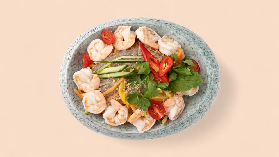 mit Garnelen, Mango, Karotten, Gurken, Minze, Koriander und Erdnüssen