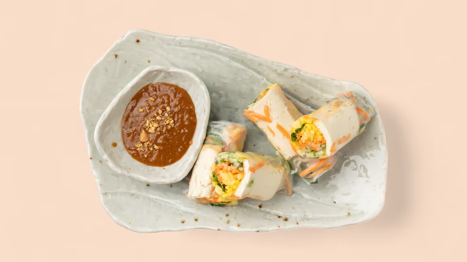 mit Tofu, Mango, Karotten, Gurke, Minze, Koriander, Basilikum und Erdnüssen