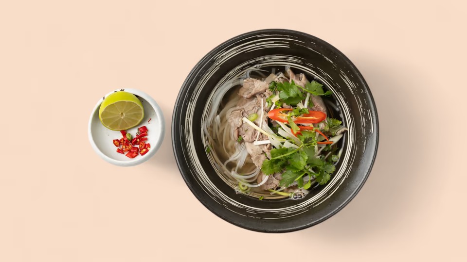 mit Rindfleisch, Reisfadennudeln, Eisbergsalat, Fischsauce, Erdnüssen, vietnamesischen Kräutern und Koriander