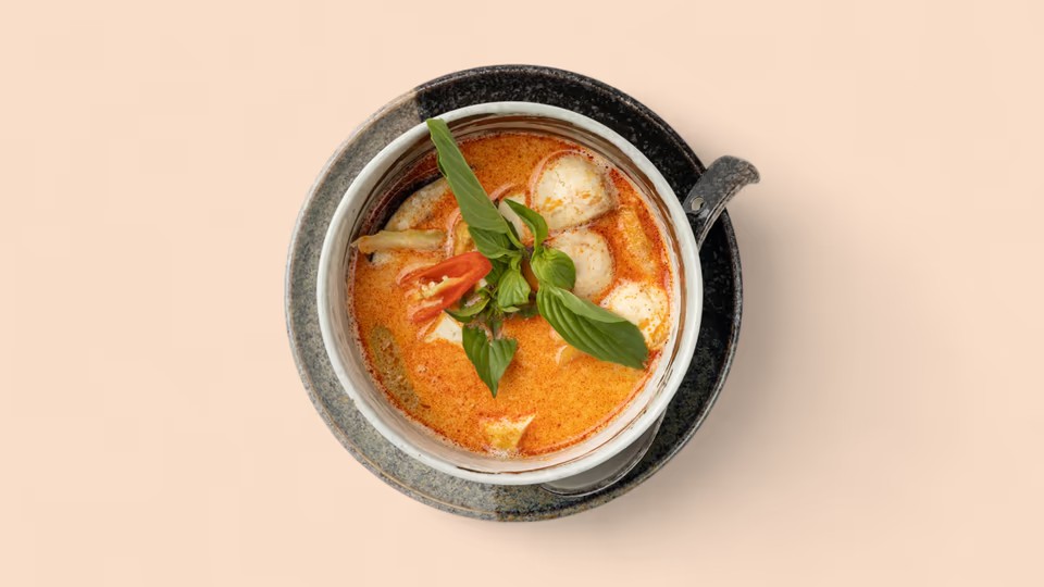 Hühnerfleisch, Kokosmilch, Zitronengras, Pilze, Sellerie und Basilikum