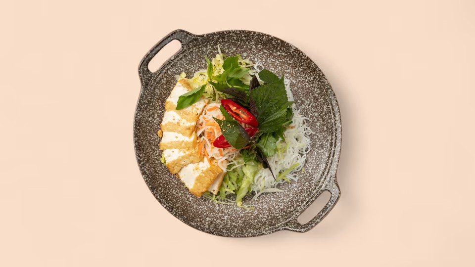 mit Reisnudeln, Eisbergsalat, Sojasoße, Erdnüssen, vietnamesischen Kräutern und Koriander